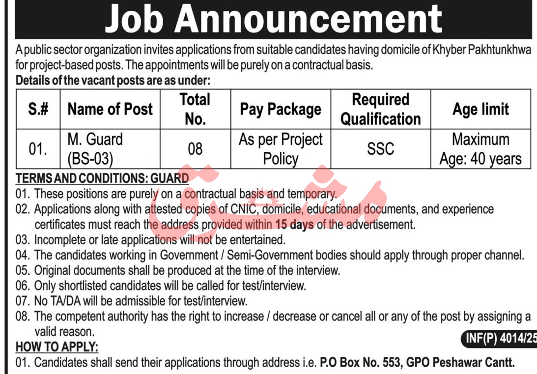 Vacant posts including guard are announced in Public Sector Organization Peshawar, peshawar Khyber Pakhtunkhwa KPK Pakistan as per 25 September 2025 advertisement in daily Mashriq Newspaper. Middle and Primary etc. educational qualification will be preferred.