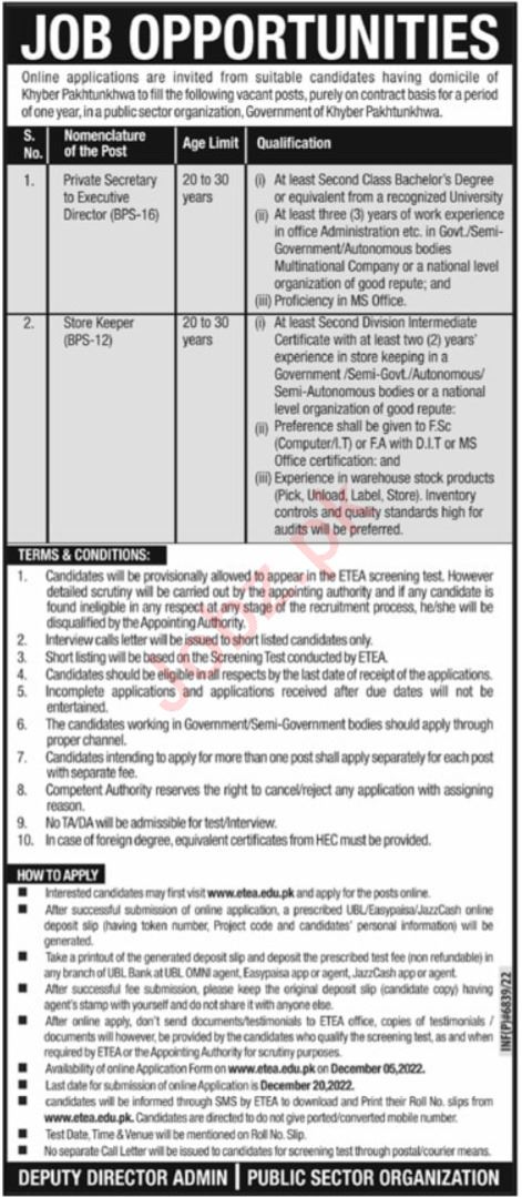 Public Sector Organization Peshawar Jobs 2022 via ETEA