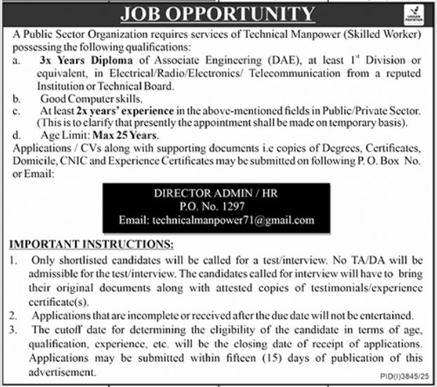 Vacant posts including skilled worker are announced in Public Sector Organization Quetta, quetta Balochistan Pakistan as per 9 November 2025 advertisement in daily Jang Newspaper. Preferred Education is Middle and Primary etc.