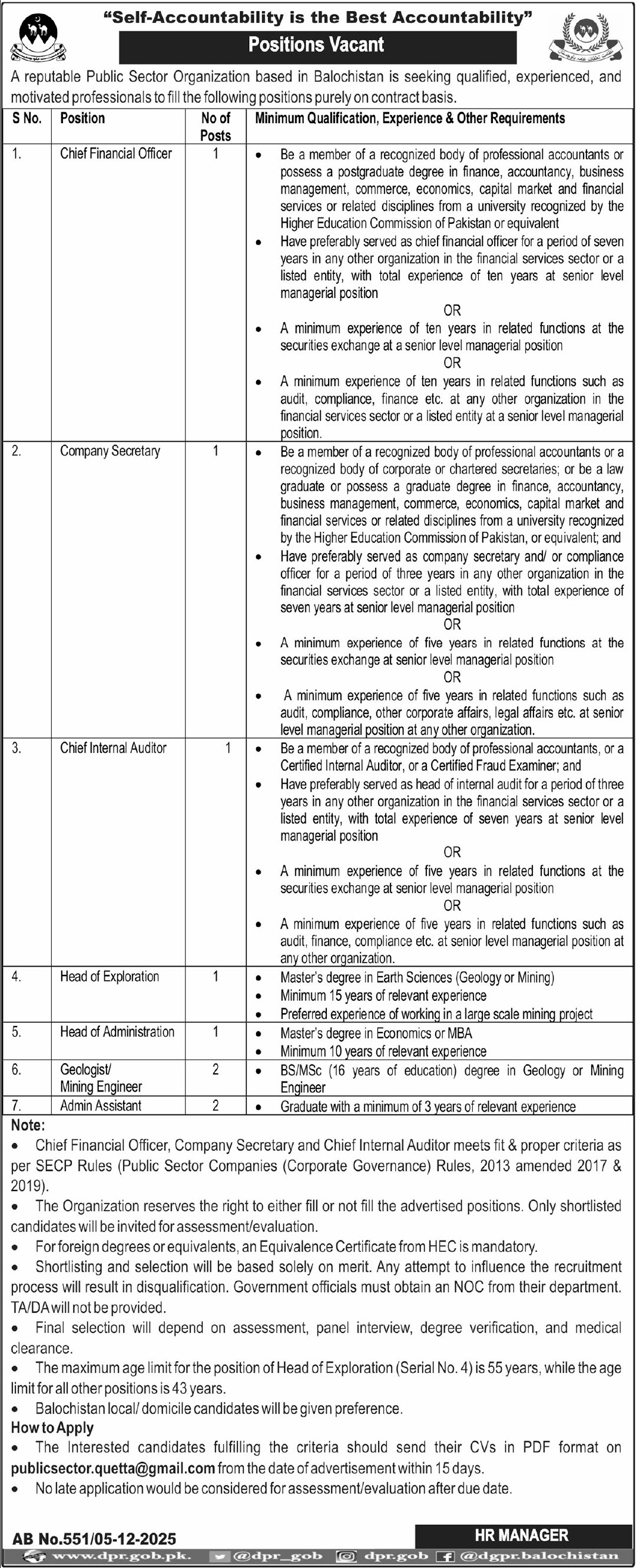 Vacant posts including Admin Assistant, Chief Financial Officer, Company Secretary, Geologist, Chief Internal Auditor, Head Of Administration, Mining Engineer and Head Of Exploration are announced in Public Sector Organization Quetta, quetta Balochistan Pakistan as per 8 December 2025 advertisement in daily Express Tribune Newspaper. Persons with Master, MS and Bachelor etc. education can apply.