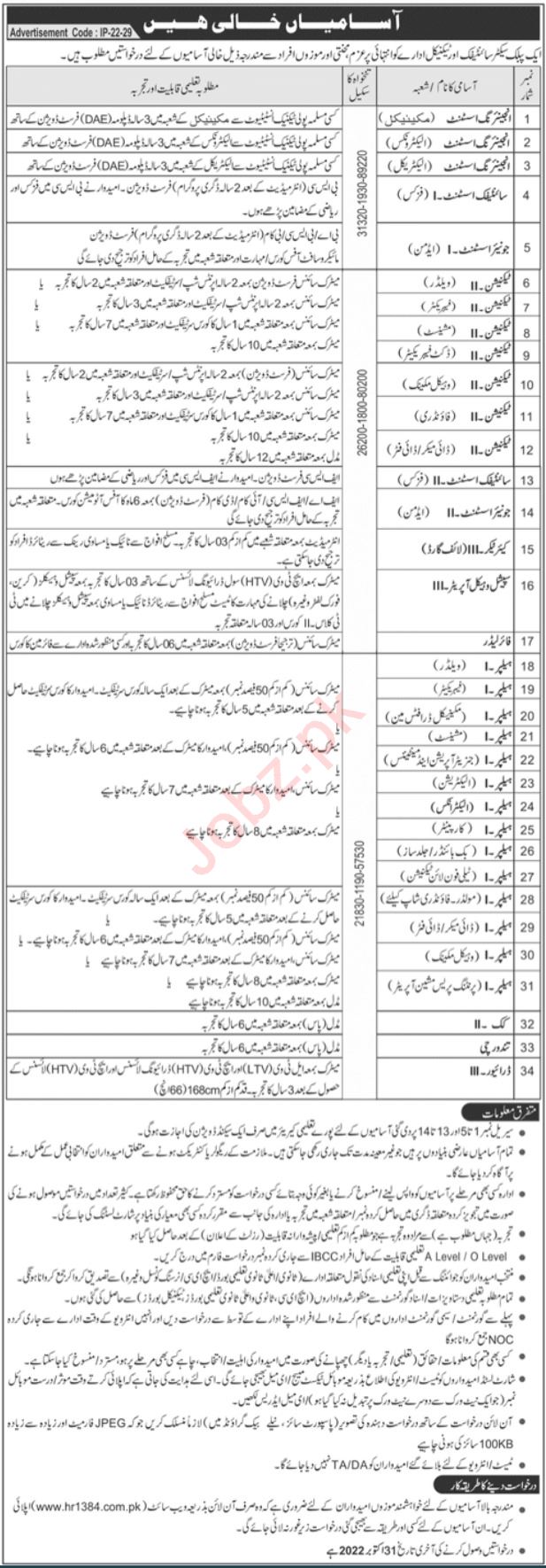 Public Sector Scientific & Technical Organization jobs advertisement dated about 16 October 2022 in daily Jang Newspaper invites application for the vacant post of technician machinist, engineering assistant electrical, scientific assistant physics, technician specialist, engineering assistant electronic, tandorchi, technician dact fabricator, engineering assistant mechanical, helper fabricator, driver, engineering assistant, helper electrician, fire leader, technician fabricator, helper, cook, special vehicle operator, technician welder, scientific scientific admin and care taker in Lahore, lahore Punjab Pakistan. Educational qualifications required MS, Bachelor and Master etc.