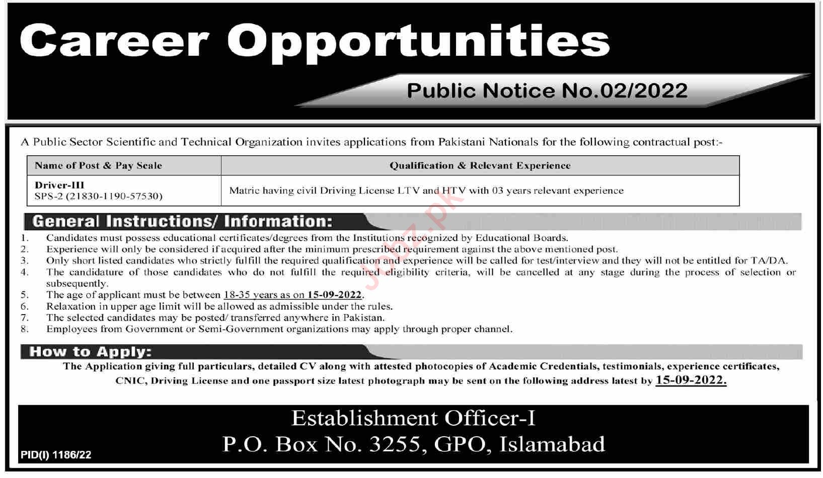 Public Sector Scientific & Technical Organization latest Government Driving jobs and others can be applied till September 15, 2022 or as per closing date in newspaper ad. Read complete ad online to know how to apply on latest Public Sector Scientific & Technical Organization job opportunities.