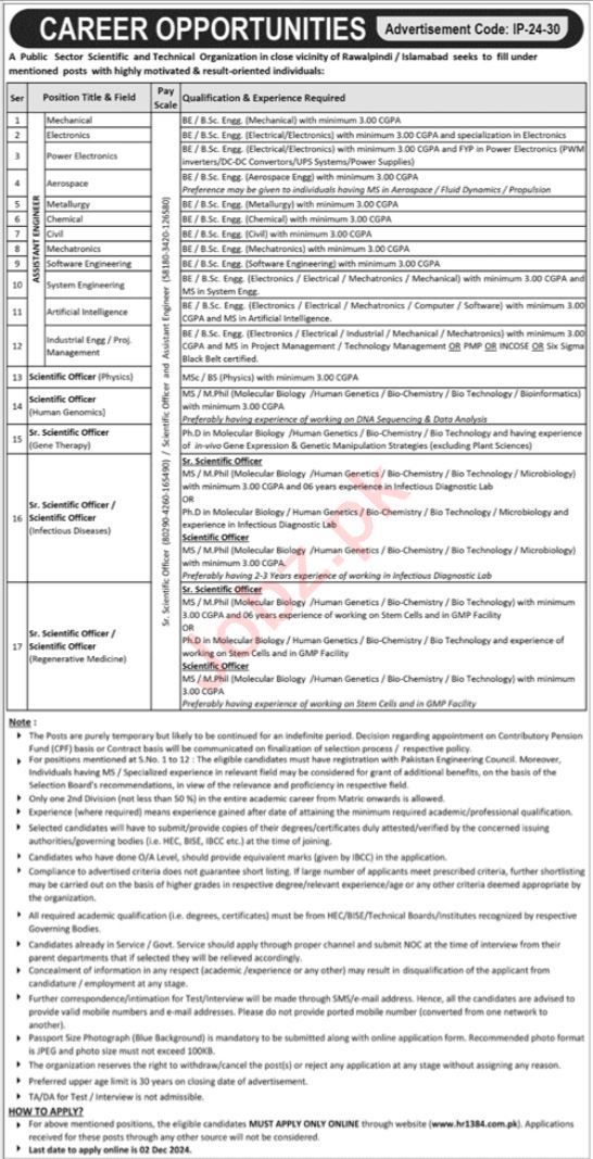 Public Sector Scientific & Technical Organization Rawalpindi, rawalpindi and islamabad Punjab Pakistan invites applications from eligible candidates for the post of Assistant Engineer and Scientific Officer as per advertisement of November 17, 2024 published in daily Jang Newspaper. Persons with B.E, Bachelor and Master etc. education can apply.