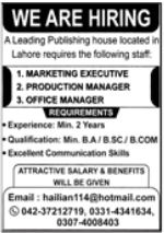 Publishing House invites applications for job positions advertised in daily Jang dated 27 March 2022 for following vacancies in Lahore, lahore Punjab Pakistan.