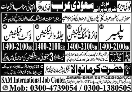 Vacant posts including fire fighting technician, duct technician, plumber and chilled water technician are announced in SAM International Jobs Centre Riyadh, riyadh Saudi Arabia as per 3 January 2024 advertisement in daily Express Newspaper. Intermediate, Middle and Matric etc. educational qualification will be preferred.