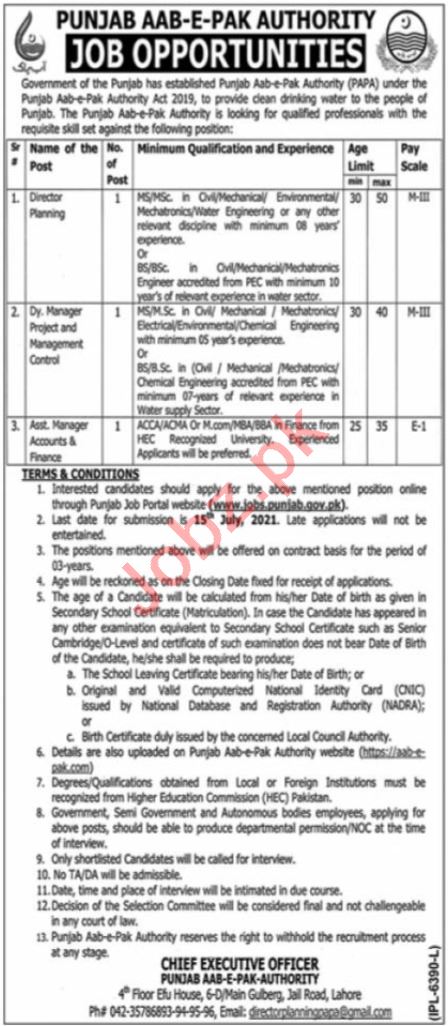 Punjab Aab e Pak Authority Lahore, Government of the Punjab is seeking experienced candidates for the posts of Director Planning, Deputy Manager, Director, Deputy Manager Project, Deputy Manager Management Control, Assistant Manager, Assistant Manager Accounts, Assistant Manager Finance.