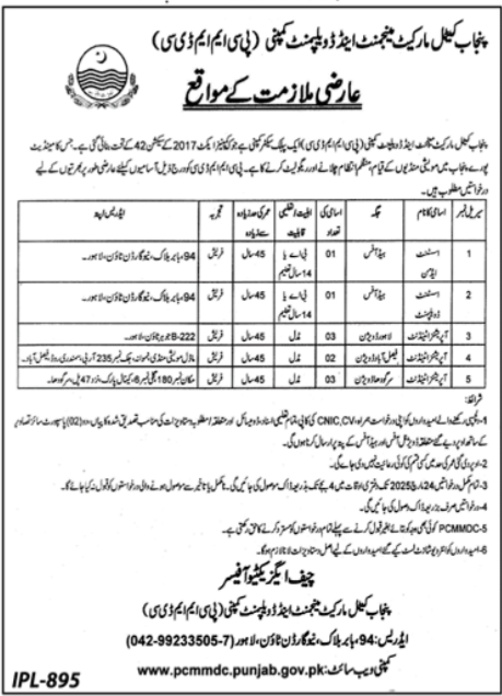 Vacancies in Punjab Cattle Market Management & Development Company Advertisement March 2025