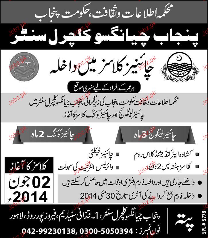Punjab Chinasoo Cultural Center Admission in Language Course in Lahore Read newspaper ad for exact details.