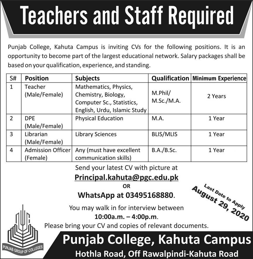 Punjab College Kahuta Campus is inviting applications from highly qualified and experienced candidates for the posts of Mathematics Teacher, Physics Teacher, Chemistry Teacher, Biology Teacher, Computer Science Teacher, Statistics Teacher, English Teacher, Urdu Teacher, Islamic Study Teacher, Physical Education Teacher, Librarian and Admission Officer.