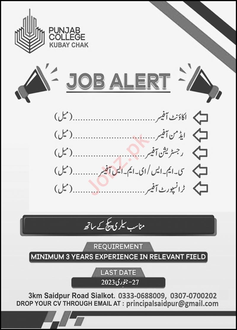 Punjab College jobs advertisement dated about 15 January 2023 in daily Nawaiwaqt Newspaper invites application for the vacant post of accounts officer, ems officer, admin officer, transport officer, registration officer and cms officer in Sialkot, sialkot Punjab Pakistan. Preferred Education is Bachelor and Master etc.