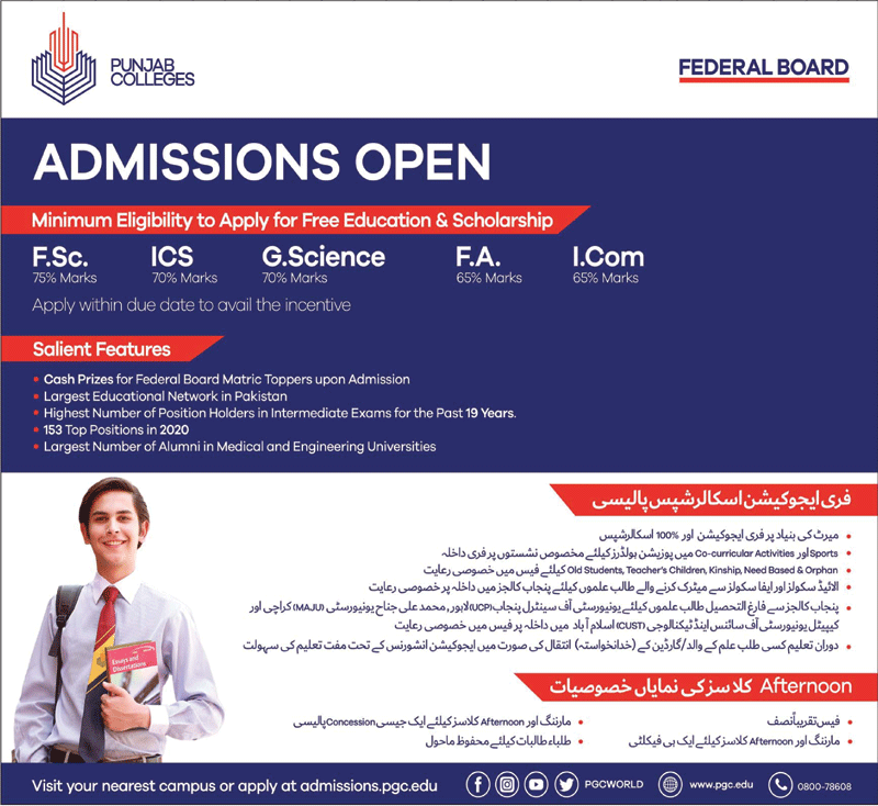 A widely spread network of Colleges across the country, Punjab Colleges has announced to offer admissions in intermediate FSc, ICS, FA, and Inter G, Science. Read newspaper ad for exact details.