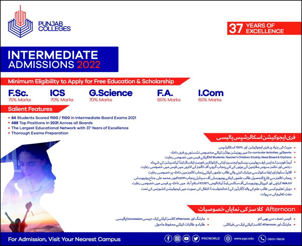 Punjab Group of Colleges PGC has announced admissions 2022 for Faculty of Science Pre-Med Pre-Engg, ICS, General Science, F.A, I.Com.. Students who want to take admissions in Punjab Group of Colleges PGC Rawalpindi Punjab Pakistan for academic year 2022 to continue education in Teaching College can apply. Students who want to enroll for academic session 2022 in Intermediate qualification and admission criteria for Private institute can apply till last date 31 August 2022. Read newspaper ad for exact details.