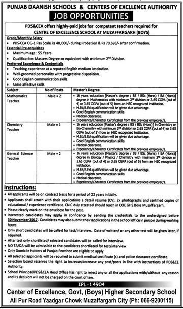 Latest Punjab Daanish Schools & Center Of Excellence Authority Teaching Posts Muzaffargarh 2025