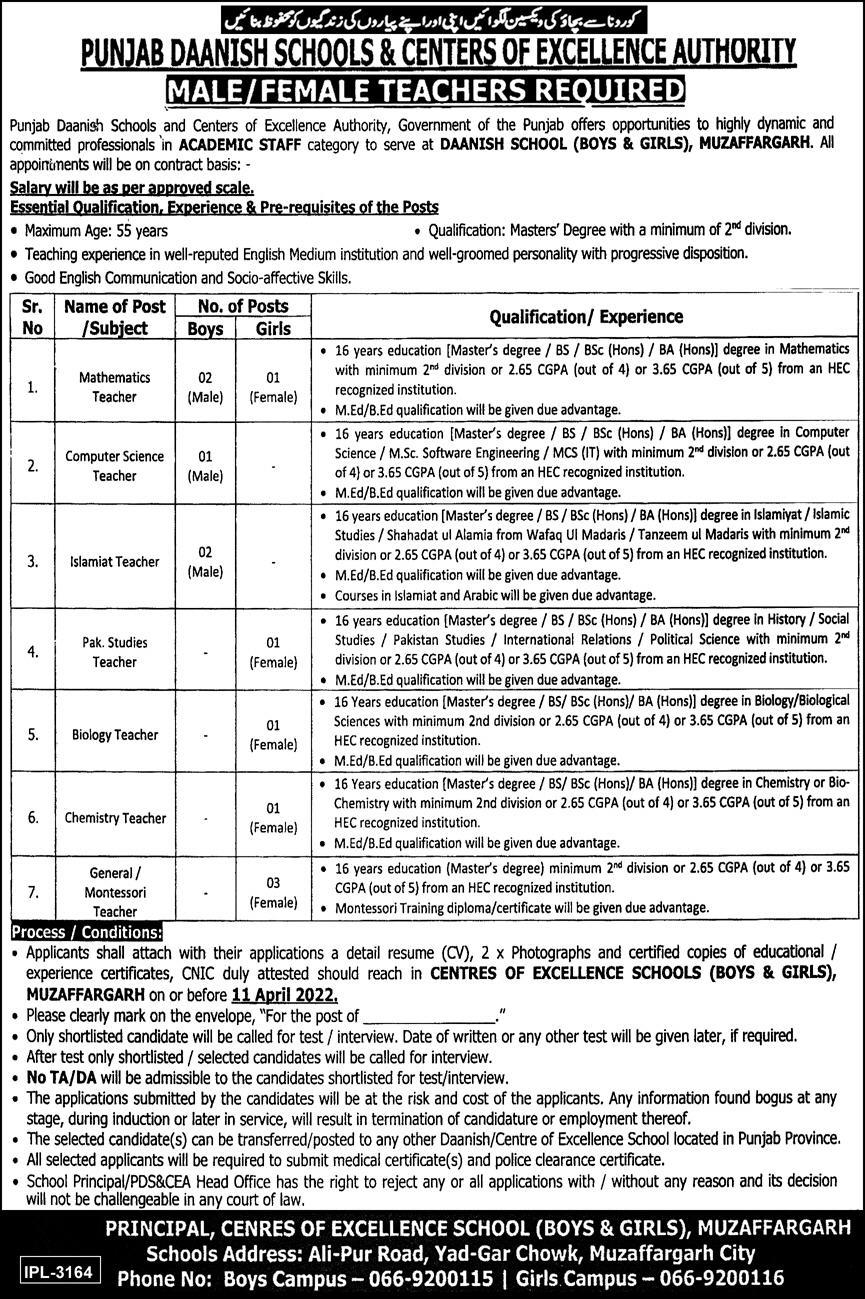 Punjab Daanish Schools & Center Of Excellence Authority Muzaffargarh, muzaffargarh Punjab Pakistan invites applications from eligible candidates for the post of general teacher, islamiat teacher, biology teacher, montessori teacher, computer science teacher, chemistry teacher, pak studies teacher, mathematics teacher and teacher as per advertisement of March 24, 2022 published in daily Express Newspaper. Educational qualifications required Bachelor, MCS, Master, M.sc and BA etc.