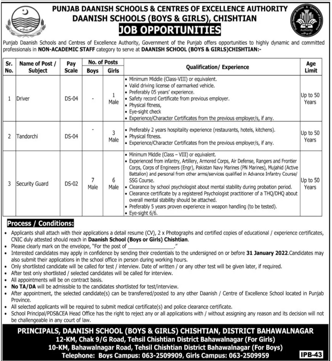 Punjab Daanish Schools & Center Of Excellence Authority jobs advertisement dated about 16 January 2022 in daily Jang Newspaper invites application for the vacant post of Tandorchi, Security Guard and Driver in Chishtian Punjab Pakistan. Persons with Primary and Middle etc. education can apply.