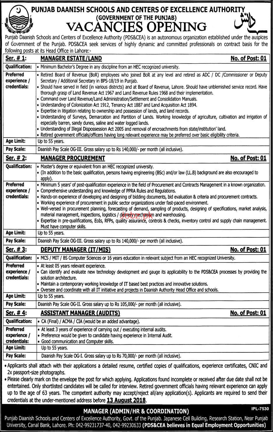 Latest Punjab Daanish Schools & Center Of Excellence Authority Management Posts Lahore 2025
