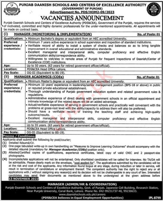 Punjab Daanish Schools & Center Of Excellence Authority Lahore, lahore Punjab Pakistan invites applications from eligible candidates for the post of manager acadmics, manager monitoring and manager implementation as per advertisement of October 22, 2023 published in daily Jang Newspaper. Persons with M.sc, MA and Master etc. education can apply.