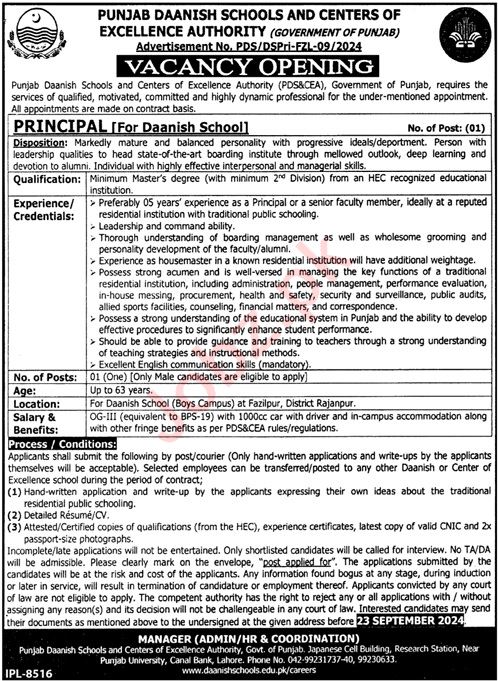 Vacancies in Punjab Daanish Schools & Center Of Excellence Authority Advertisement September 2024