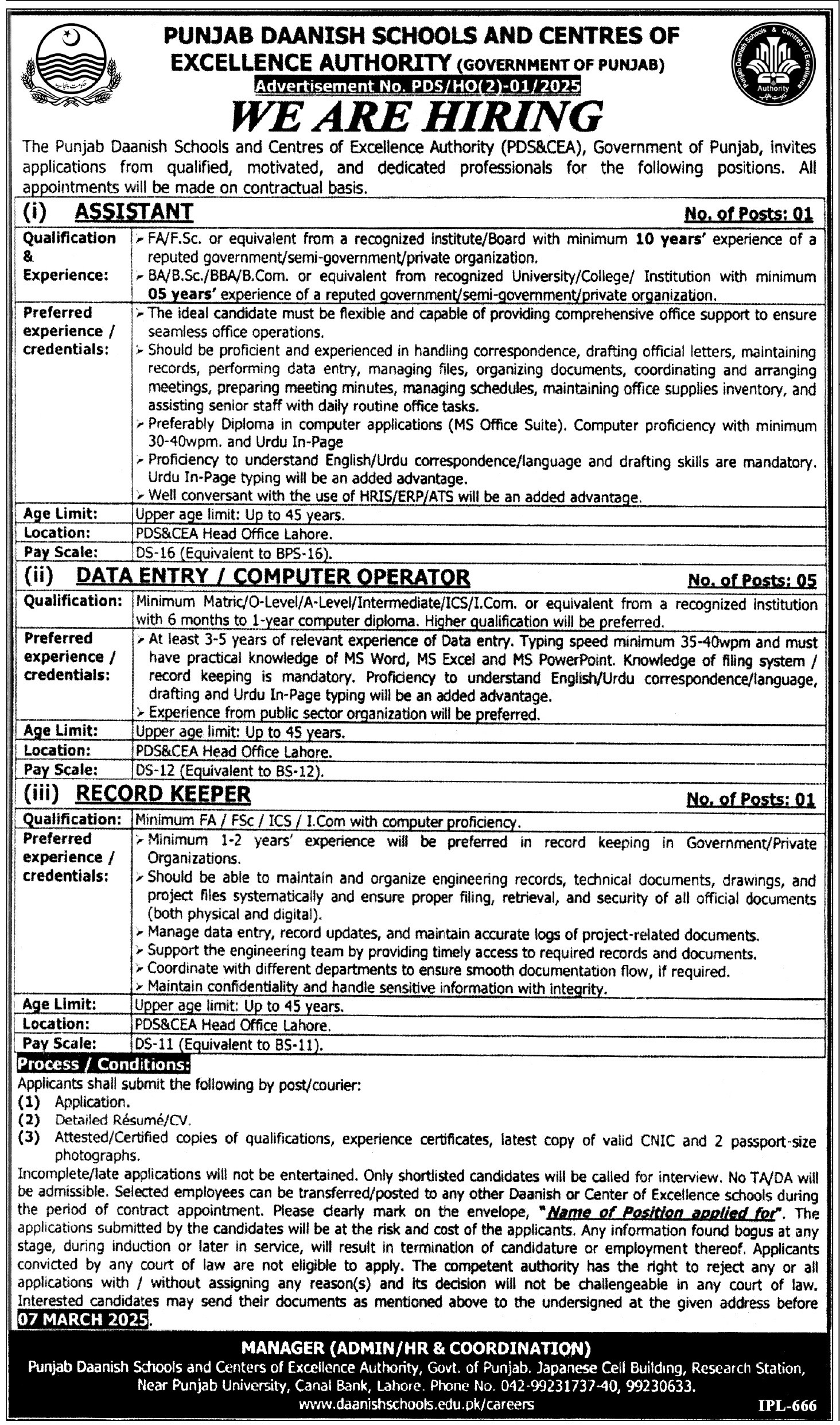 Punjab Daanish Schools & Center Of Excellence Authority Canal Bank Road Lahore, lahore Punjab Pakistan invites applications from eligible candidates for the post of record keeper, assistant, data entry operator and computer operator as per advertisement of February 18, 2025 published in daily Express Tribune Newspaper. Persons with Intermediate, Bachelor and Matric etc. education can apply.