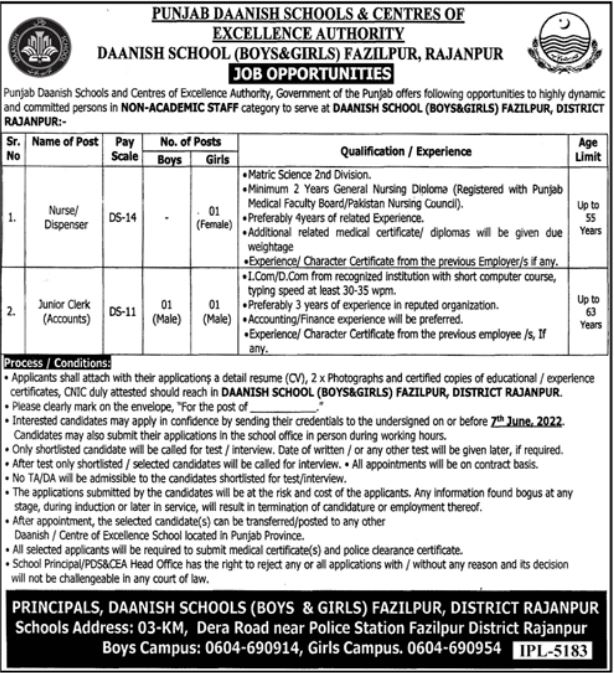 Punjab Daanish Schools & Center Of Excellence Authority jobs advertisement dated about 20 May 2022 in daily Jang Newspaper invites application for the vacant post of dispenser, nurse and clerk in Rajanpur, rajanpur Punjab Pakistan. Persons with I.com, Intermediate and Matric etc. education can apply.