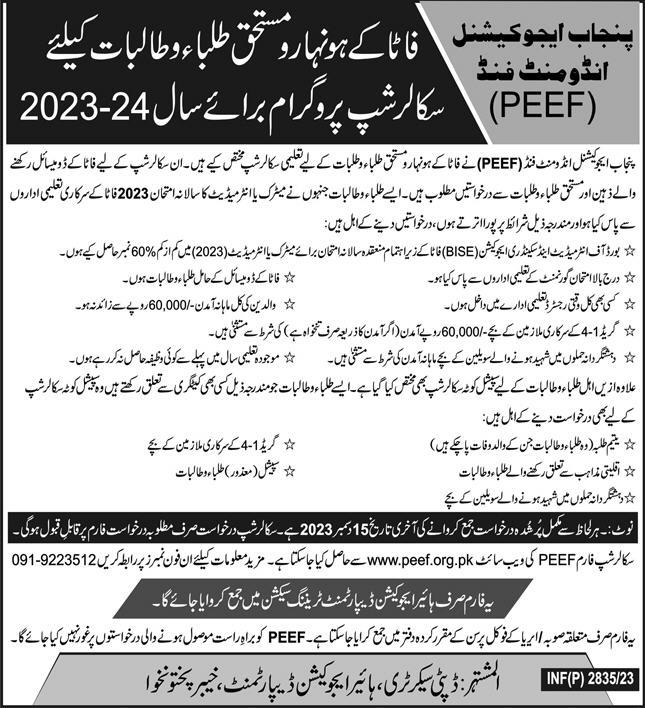 The Punjab Educational Endowment Fund PEEF Scholarship admissions 2023 has been started. Eligible students who qualify as per admission criteria in The Punjab Educational Endowment Fund PEEF Peshawar Khyber Pakhtunkhwa KPK Pakistan can apply in Science College for academic year 2023. Students who want to enroll for academic session 2023 in Intermediate and Matric qualification and admission criteria for Government institute can apply till last date 15 December 2023. Read newspaper ad for exact details.