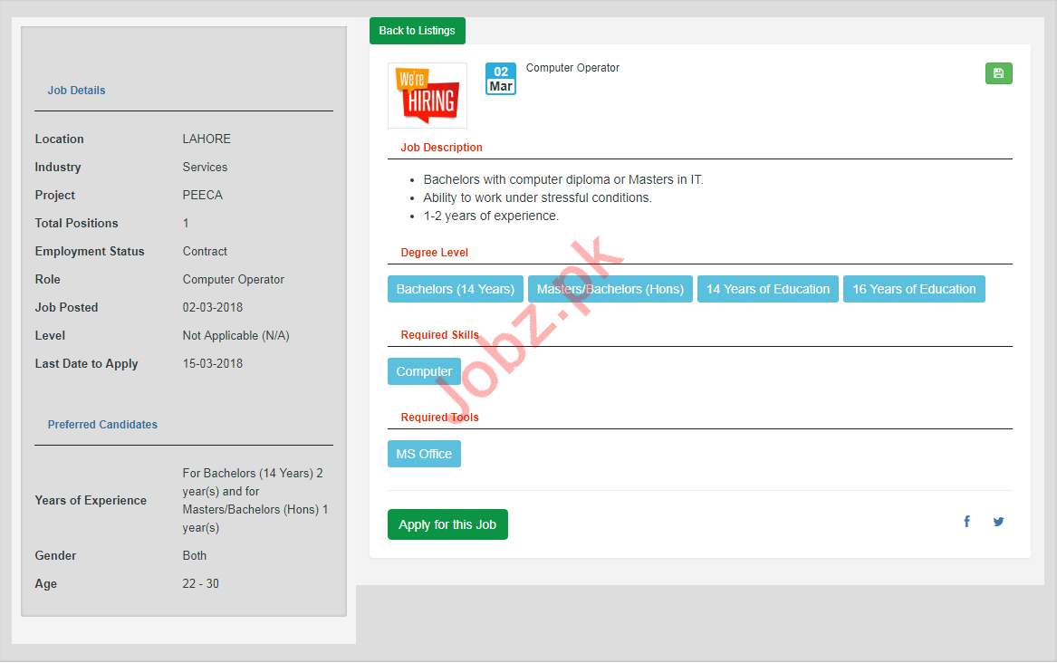 Apply as per details in job advertisement. Login to view further details of how to apply via https://www.jobz.pk online.