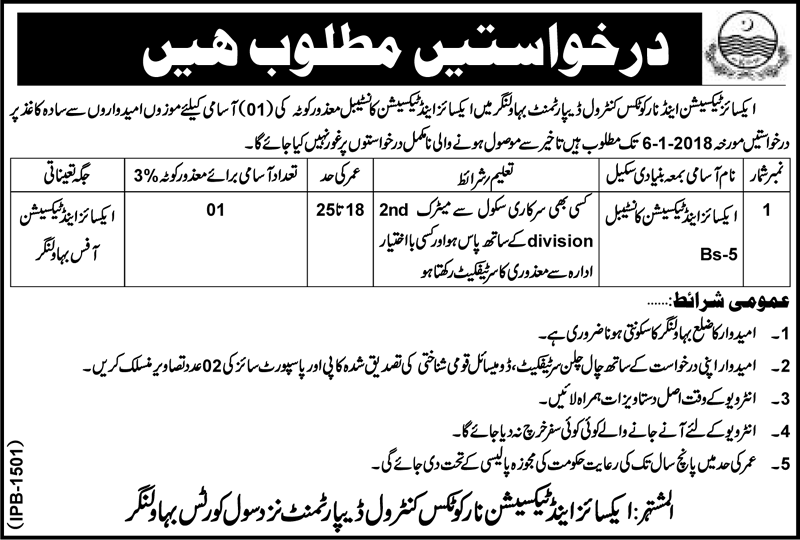 Latest Excise Taxation & Narcotics Control Department Security Posts Bahawalnagar 2025