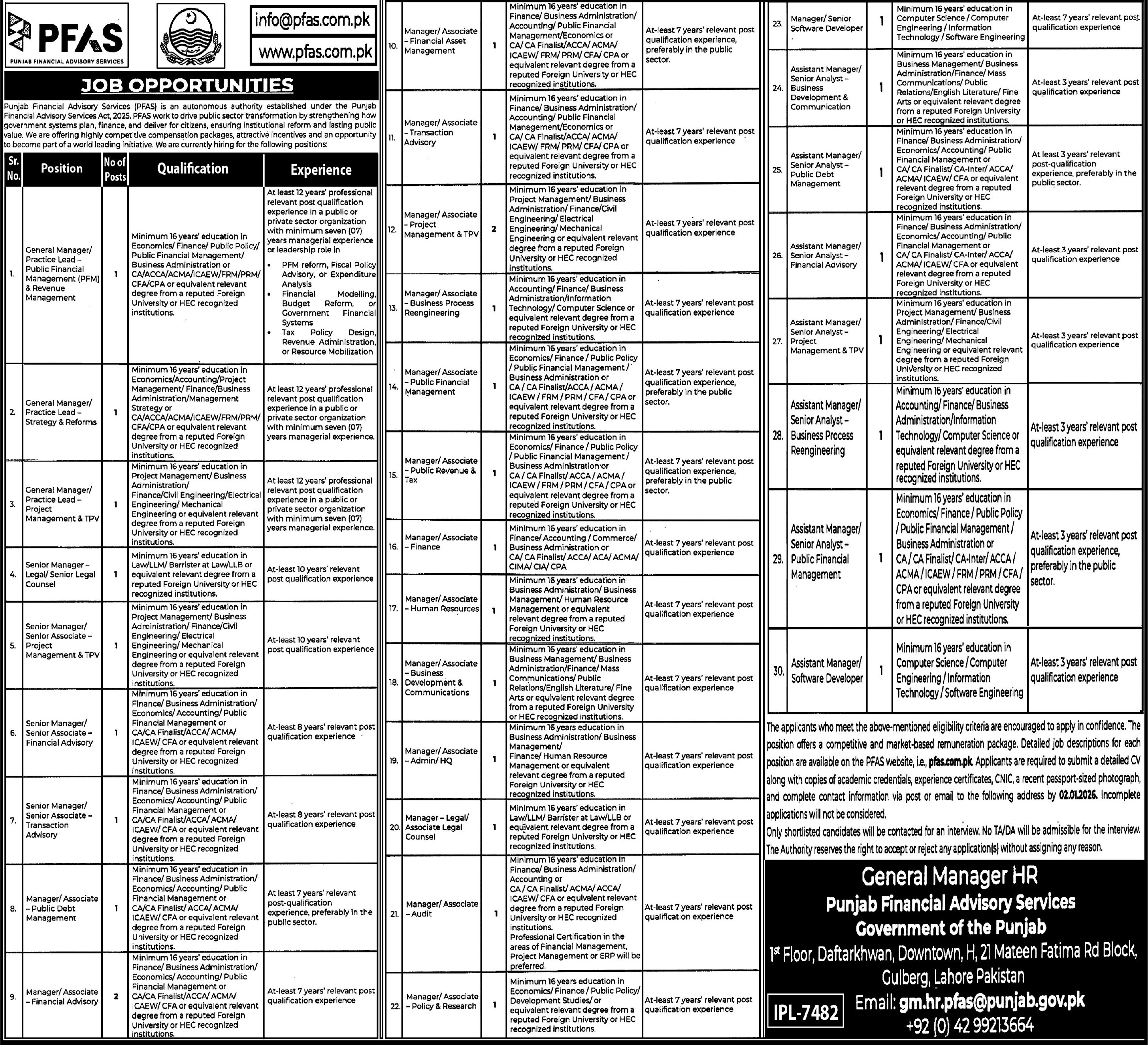Punjab Financial Advisory Services PFAS Gulberg Lahore, lahore Punjab Pakistan invites applications from eligible candidates for the post of manager, associate legal counsel, analyst business development, assistant manager software developer, manager software developer, analyst financial advisory, assistant manager, analyst public financial management, associate policy research, analyst business development communication, associate hq, associate business development, manager associate public debt management, manager associate financial asset management, associate public revenue tax, associate public financial management, associate project managenet, associate financial asset management, manager associate audit, associate business processing reengineering, manager associate public revenue tax, associate public debt management, associate audit, practice lead, analyst business process reengineering, associate human resource, analyst public debt management, manager legal, associate transaction advisory, associate business communications, manager associate human resource, general manager tpv, software developer, analyst project management, associate financial advisory, general manager revenue management, legal counsel, manager associate transaction advisory, manager associate financial advisory, general manager, general manager project management, general manager strategy, associate admin, manager associate finance, general manager public financial management, general manager reforms, general manager pfm and associate finance as per advertisement of December 16, 2025 published in daily Express Tribune Newspaper. Candidates with MIT, CA, LLM, Master, MS, B.E, LLb, Others, MCS, ACCA, M.com, Bachelor, MBA and M.sc etc. educational background will be preferred.