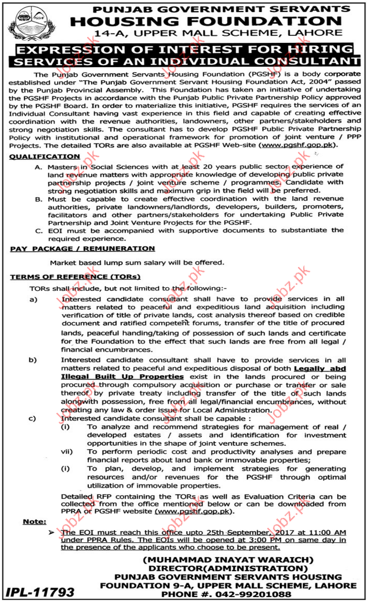 Punjab Government Servants Housing Foundation PGSHF Jobs