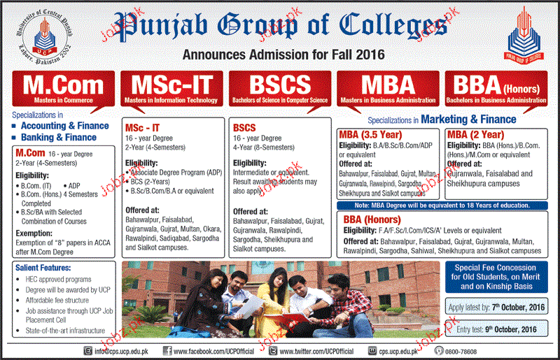 Punjab Group of College Admission in M.Com, BSCS, MBA and BBA in Lahore. Read newspaper ad for exact details.