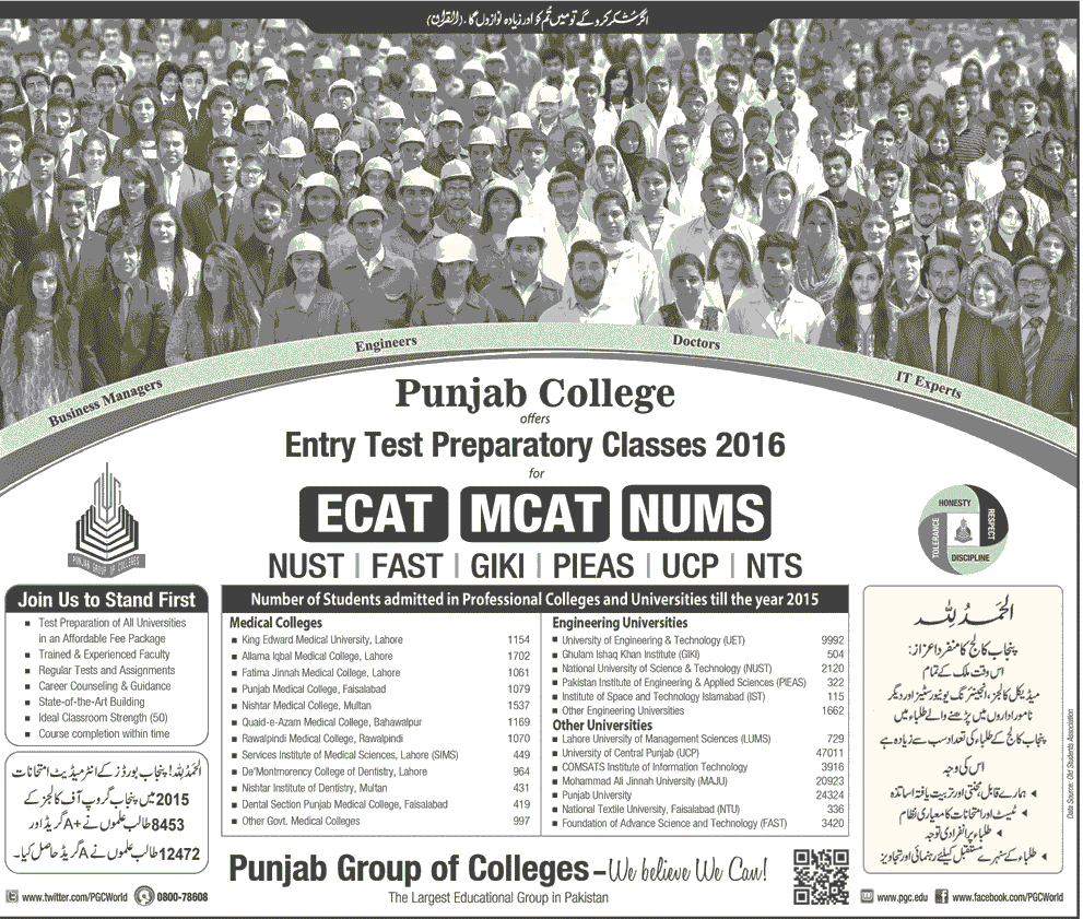 Punjab Group of Colleges Admission in Entry Test Preparation in Lahore. Read newspaper ad for exact details.