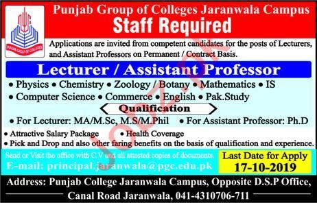 Punjab Group of Colleges invites applications from highly qualified and well educated candidates for the positions of Assistant Professor, Physics Lecturer, Chemistry Lecturer, Zoology Lecturer, Botany Lecturer, Mathematics Lecturer, Islamic Studies Lecturer, Computer Science Lecturer, Commerce Lecturer, English Lecturer, Pakistan Study Lecturer in Jaranwala.