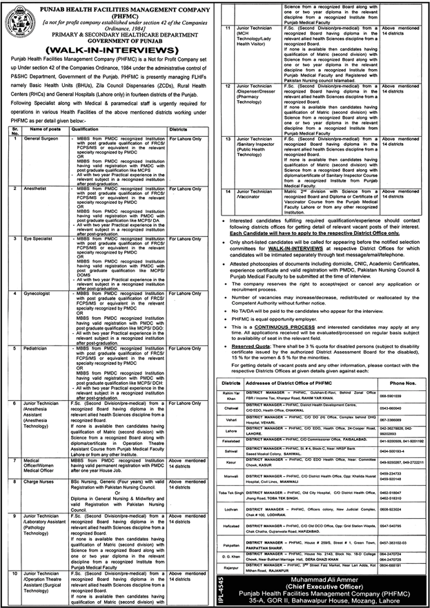Punjab Health Facilities Management Company PHFMC Jobs
