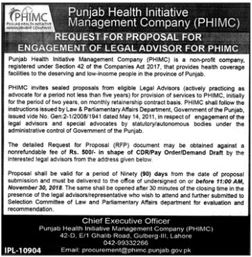 Latest Punjab Health Initiative Management Company PHIMC Legal Posts Lahore 2025