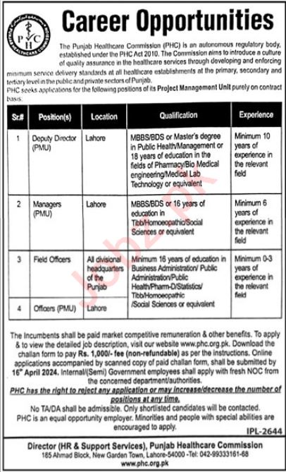 Punjab Health Commission PHC is looking for candidates for following posts as per job advertisement published in daily Jang Newspaper of March 31, 2024 for location Lahore, lahore Punjab Pakistan: