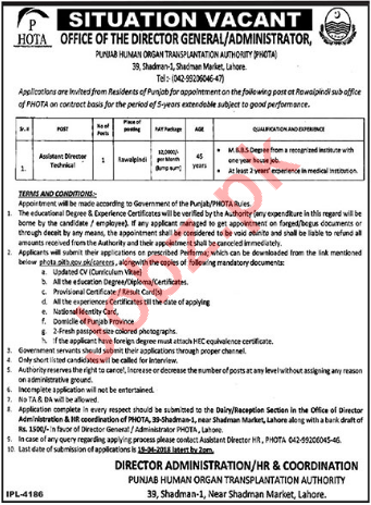 Punjab Human Organ Transplant Authority PHOTA Rawalpindi, Health Department, Government of the Punjab required candidates for the posts of Assistant Director Technical.