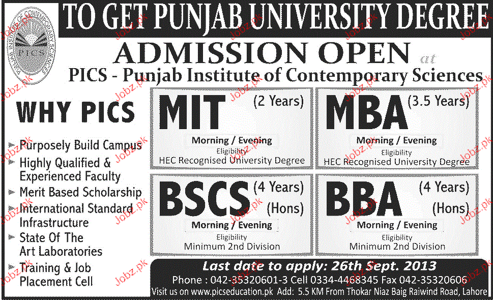 Punjab Institute of Contemporary Sciences Admission in BBA, MBA, MIT and BSCS in Lahore Read newspaper ad for exact details.