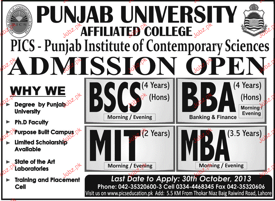Punjab Institute of Contemporary Sciences Admission in BSCS, BBA, MIT and MBA in Lahore Read newspaper ad for exact details.