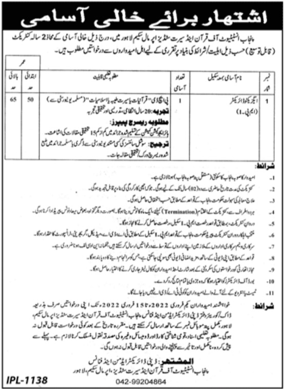 Punjab Institute of Quran & Seeret Studies jobs advertisement dated about 1 February 2022 in daily Jang Newspaper invites application for the vacant post of Executive Director in Lahore Punjab Pakistan. Candidates with Phd etc. educational background will be preferred.