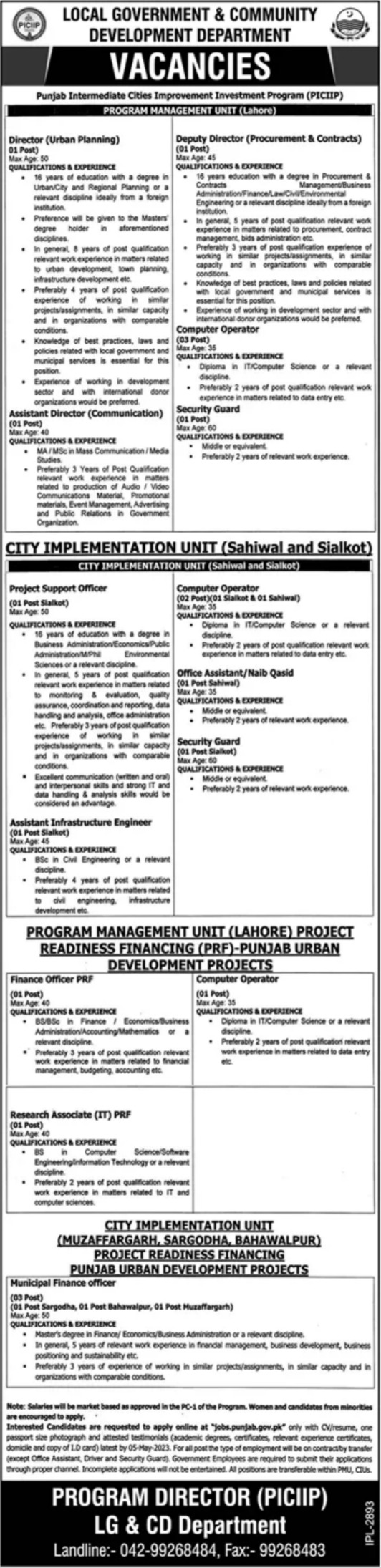 Local Government & Community Development Department jobs advertisement dated about 21 April 2023 in daily Dunya Newspaper invites application for the vacant post of security guard, naib qasid, office assistant, assistant infrastructure engineer, assistant director, deputy director procurement, assistant director communications, project support officer, director, deputy director, deputy director contracts, director urban planning, municipal finance officer, finance officer, research associate and computer operator in Lahore, sahiwal, bahawalpur, sialkot, lahore, muzaffargarh and sargodha Punjab Pakistan. Educational qualifications required Middle, Master, M.sc, Intermediate, DAE, BCS, B.E, MS, M.com, MBA, MA, Bachelor and BBA etc.