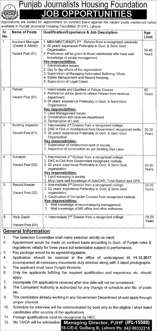 Latest Punjab Journalists Housing Foundation PJHF Management Posts Lahore 2025