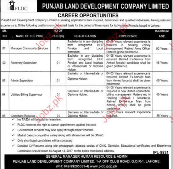 A well reputed Punjab Land Development Company is looking for Manager Community services, Recovery Supervisor, Admin Supervisor, Utilities Billing Supervisor, Complaint Receiver. Interested candidate can apply. Candidate can apply. candidate must have experience in relevant field.