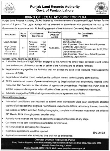 Vacant posts including legal advisor are announced in Punjab Land Records Authority PLRA Lahore, lahore Punjab Pakistan as per 14 March 2024 advertisement in daily The News Newspaper. Candidates with Bachelor, Master and LLb etc. educational background will be preferred.