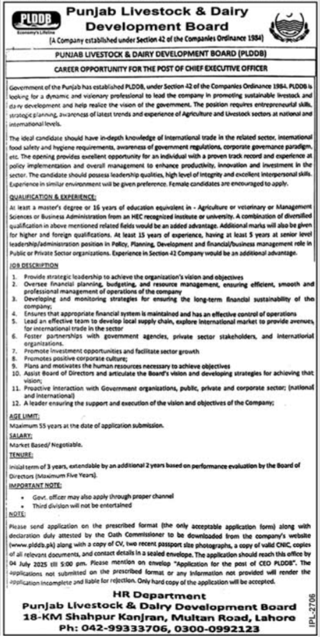 Latest Management jobs and others Government jobs in Punjab Livestock & Dairy Development Board PLDDB closing date is around July 4, 2025, see exact from ad. Read complete ad online to know how to apply on latest Punjab Livestock & Dairy Development Board PLDDB job opportunities.