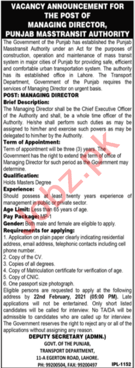 Punjab Masstransit Authority Lahore Jobs 2021 For Director