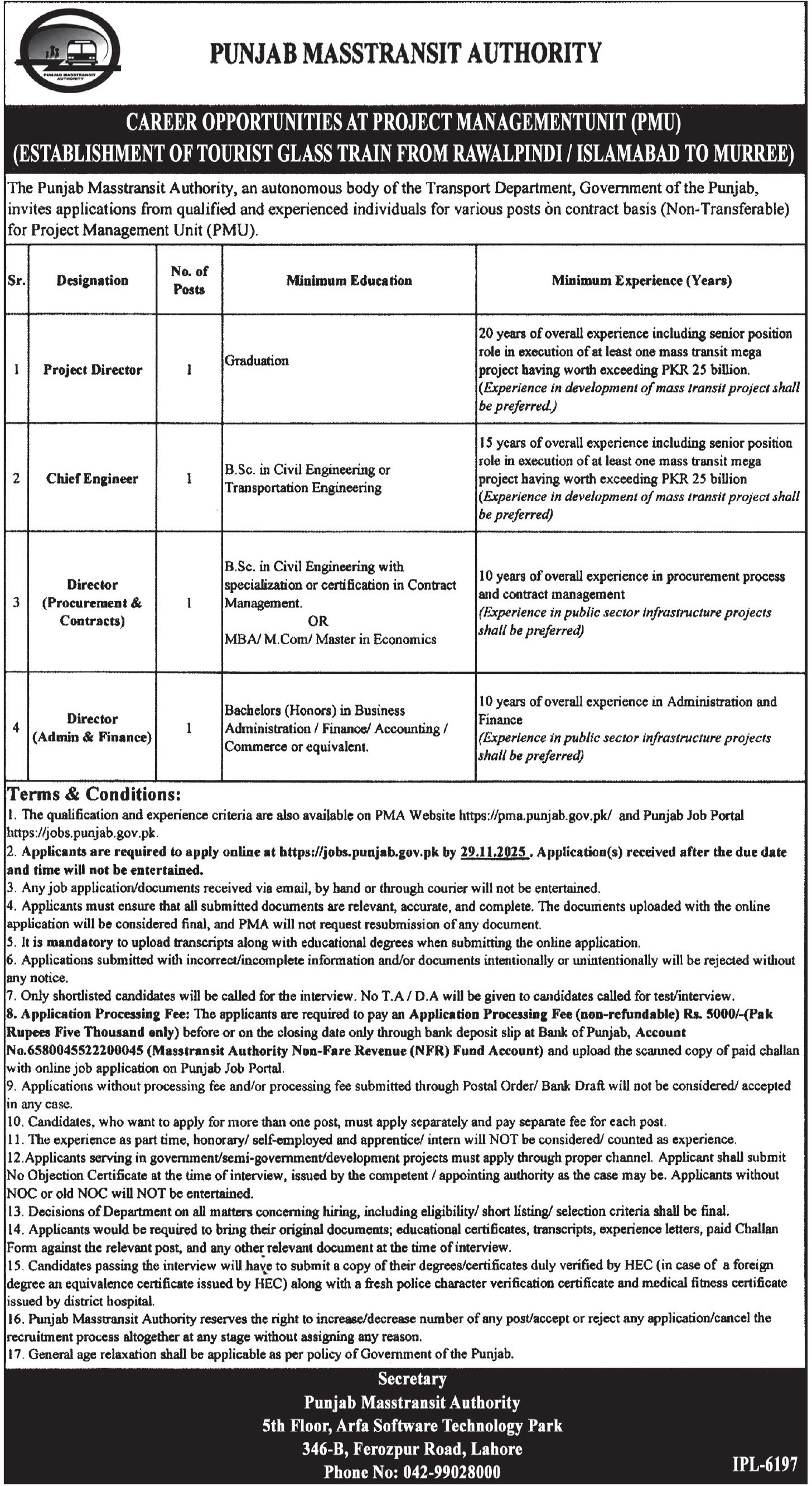 Punjab Masstransit Authority PMA Ferozepur Road Lahore, lahore Punjab Pakistan invites applications from eligible candidates for the post of chief engineer, director contracts, director procurement, civil engineer, director finance, project director, director admin and director as per advertisement of November 14, 2025 published in daily Express Tribune Newspaper. Persons with MBA, Bachelor, Others, BBA, B.com, M.com, Master and B.E etc. education can apply.