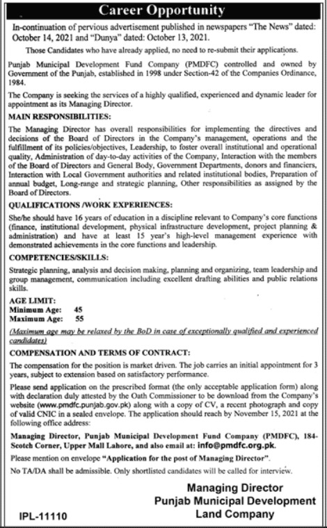 Vacancies in Punjab Municipal Development Fund Company PMDFC Advertisement October 2021