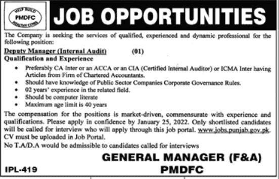 Apply at Punjab Municipal Development Fund Company PMDFC latest Government jobs in Accounting and departments before closing date which is around January 25, 2022 or as per closing date in newspaper ad. Read complete ad online to know how to apply on latest Punjab Municipal Development Fund Company PMDFC job opportunities.
