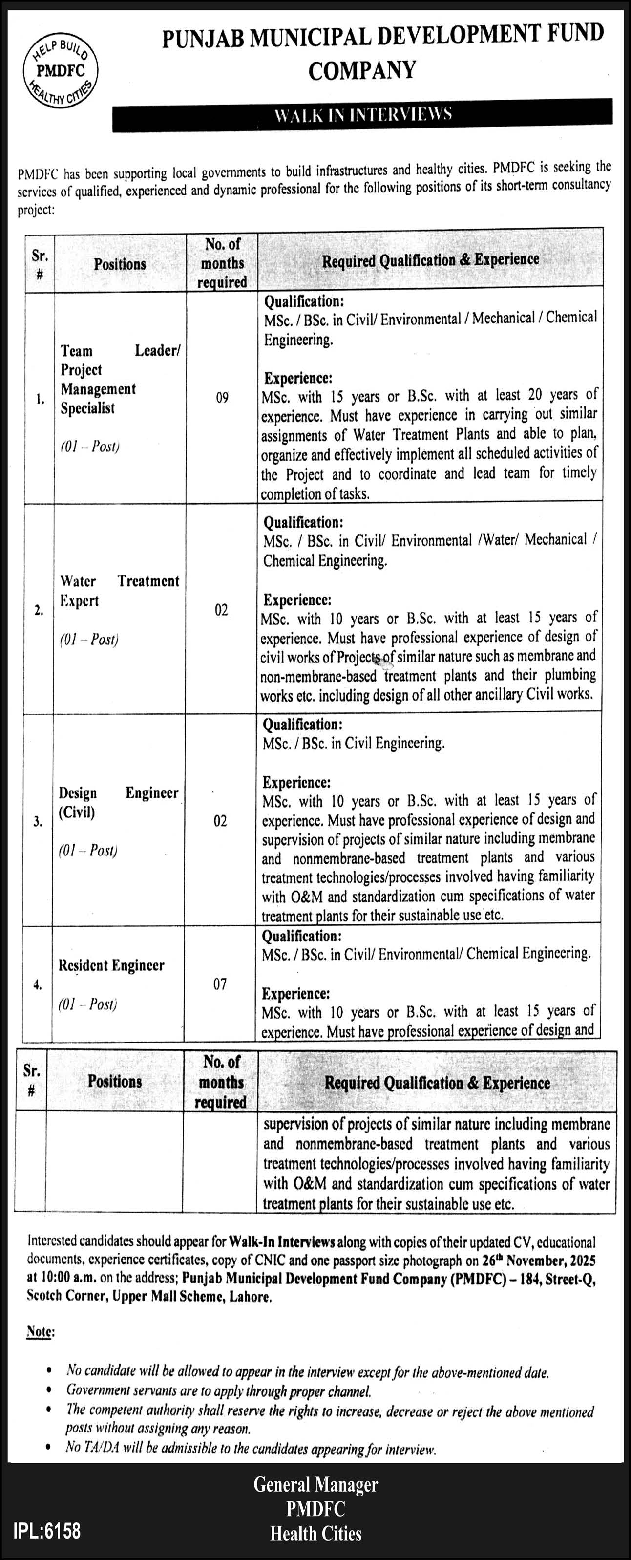 Vacant posts including resident engineer, design engineer, team leader, water treatment expert and project management specialist are announced in Punjab Municipal Development Fund Company PMDFC Lahore, lahore Punjab Pakistan as per 12 November 2025 advertisement in daily Other Newspaper. Persons with M.sc, MS, Master and Bachelor etc. education can apply.