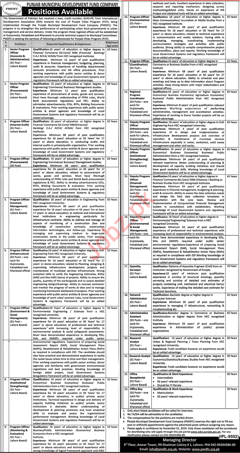 Punjab Municipal Development Fund Company, an Government Organization in Lahore is looking for qualified, expert and Well-Mannered staff for their Organization for the Job of Accounts Program Officer, Procurement Program Officer, Internal Audit, Procurement Officer, Management Program Officer, Infrastructure Program Officer, Environment Program Officer, Institutional Program Officer, Monitoring Program Officer, Communication Program Officer, Coordination Program Officer, Regional Program Coordinator, Deputy Program Officer Infrastructure, Deputy Program Officer Institutional, Deputy Program Officer Financial Management, Deputy Program Officer Environmental, Quantity Surveyor, Network Administrator, Administrative Assistant, Research Analyst, Office Receptionist, Office Boy.